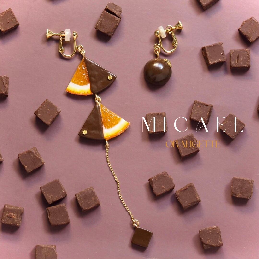 トライアングル・オランジェットとボンボン・ショコラのアシンメトリーイヤリング/ピアス
